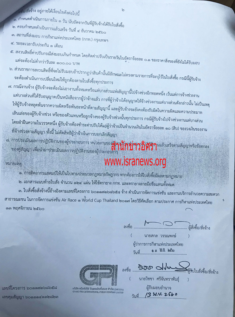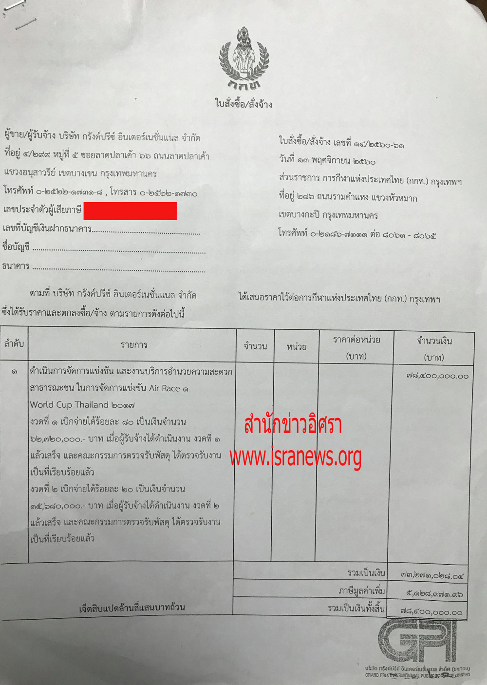 ล่าสุด สำนักข่าวอิศรา ได้รับมอบใบสั่งซื้อ/สั่งจ้าง การจัดงานนี้ ระหว่าง กกท. และ บริษัท กรังด์ปรีซ์ อินเตอร์เนชั่นแนล จำกัด จากแหล่งข่าวระดับสูงในกระทรวงการท่องเที่ยวและกีฬา เป็นทางการ เพื่อยืนยันข้อมูลที่ตรวจสอบพบไปก่อนหน้านี้