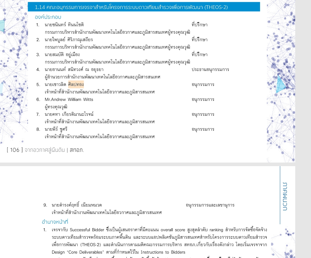 เบื้องต้น สำนักข่าวอิศรา ได้สืบค้นข้อมูลเพิ่มเติมจากหนังสือชื่อว่า “จากอวกาศสู่ผืนดิน” ซึ่งเป็นรายงานการปฏิบัติภารกิจของ สทอภ. ประจำปี 2560 และข้อมูลในหน้าที่ 106 ของหนังสือระบุรายชื่อคณะอนุกรรมการเจรจาสำหรับโครงการระบบดาวเทียมสำรวจเพื่อการพัฒนา (THEOS-2) จำนวน 9 คน ประกอบด้วย