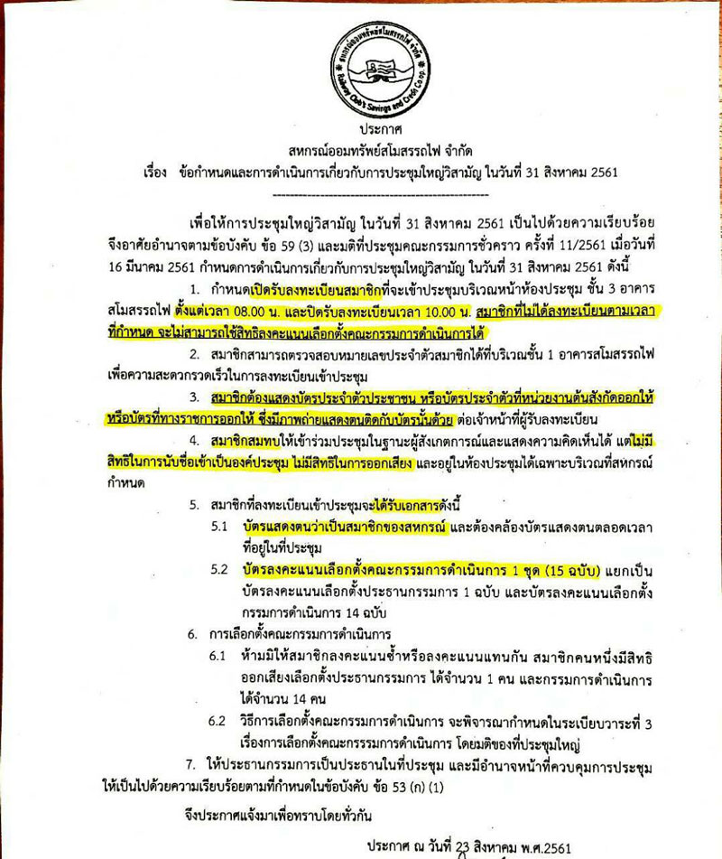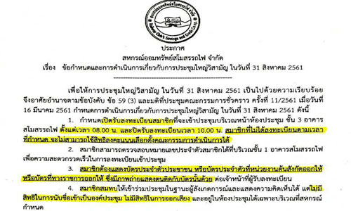 แต่ปรากฏว่าเมื่อวันที่ 23 ส.ค.2561 ที่ผ่านมา คณะกรรมการบริหารสหกรณ์ออมทรัพย์สโมสรรถไฟชั่วคราว ได้ออกประกาศแจ้งข้อกำหนดและการดำเนินการเกี่ยวกับการประชุมใหญ่วิสามัญดังกล่าว ซึ่งมีข้อห้ามสำคัญหลายเรื่องที่อาจทำให้สมาชิกเสียสิทธิการเข้าประชุมเพื่อลงคะแนนเสียง อาทิ กำหนดเวลาลงทะเบียนในช่วง 08.00 -10.000 น. สมาชิกที่ไม่ได้ลงทะเบียนตามเวลา จะไม่สามารถใช้สิทธิลงคะแนนเลือกตั้งคณะกรรมการดำเนินการได้ สมาชิกสมทบที่เข้าร่วมประชุมสังเกตการณ์ได้ แต่ไม่มีสิทธิในการนับชื่อเข้าเป็นองค์ประชุม ไม่มีสิทธิในการออกเสียง ทำให้ถูกมองว่าเป็นความพยายามของคนบางกลุ่ม ที่จะสกัดกันไม่ให้สมาชิกกลุ่มที่เคลื่อนไหวตรวจสอบปัญหาการทุจริตเข้าไปทำหน้าที่เป็นคณะกรรมการดำเนินการที่มีสิทธิเข้าถึงเอกสารหลักฐานที่เกี่ยวข้องกับการกระทำความผิดได้ (ดูประกาศท้ายเรื่อง)