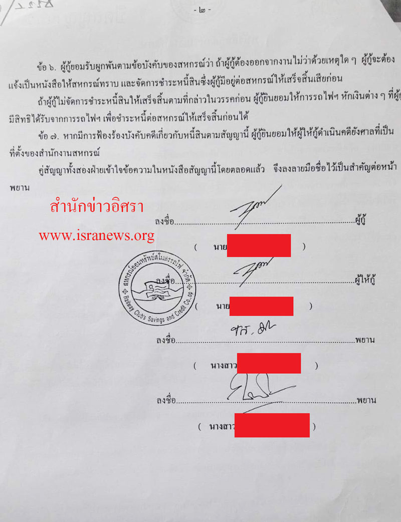 "...ล่าสุด สำนักข่าวอิศรา ได้รับมอบหลักฐานหนังสือกู้เงินพิเศษ ของสหกรณ์ออมทรัพย์สโมสรรถไฟ จำกัด จากแหล่งข่าวในสหกรณ์ออมทรัพย์สโมสรรถไฟ จำกัด เพื่อยืนยันข้อเท็จจริงเกี่ยวกับปัญหาการทำสัญญากู้ยืมเงินที่ไม่ถูกต้องดังกล่าว โดยในสัญญาฉบับนี้ ระบุจัดทำขึ้นเมื่อวันที่ 15 ธ.ค.2557 วงเงินกู้อยู่ที่ตัวเลข 15 ล้านบาท ตกลงส่งคืนเงินกู้เป็นงวดรายเดือนเท่ากัน เดือนละ 41,677 บาท พร้อมดอกเบี้ยในอัตราร้อยละ 6.50 ต่อปี รวมจำนวน 360 งวด ปรากฎชื่ออดีตผู้บริหารสหกรณ์รายหนึ่ง ลงนามในฐานะ "ผู้กู้" และ "ผู้ให้กู้"..."