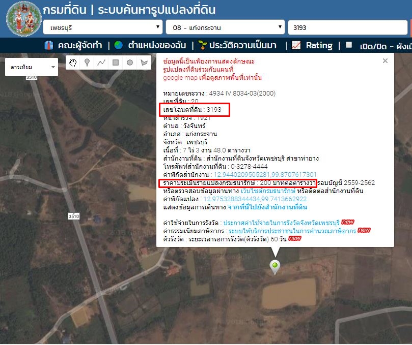 พบว่า เป็นที่ดินดังกล่าวตั้งอยู่ที่อำเภอแก่งกระจาน จังหวัดเพชรบุรี เนื้อที่ 7 ไร่ 3 งาน 48 ตารางวา