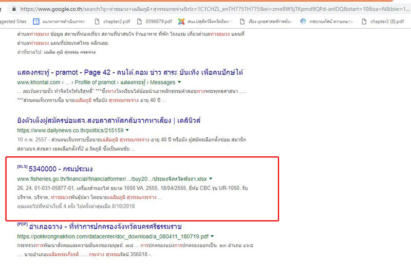 ขณะที่ฐานข้อมูลในโลกออนไลน์ เกี่ยวกับ ร้านท่าชะมวงพันธุ์ปลา ปรากฎเพียงแค่ว่า เป็นของ นายเฉลิมภูมิ สุวรรณกระจ่าง เคยบริจาค ครุภัณฑ์ ให้กับกรมประมงเท่านั้น