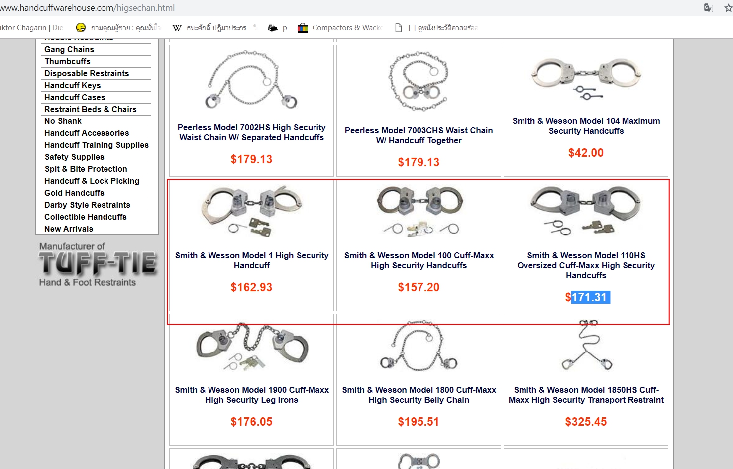 ขณะที่กญแจมือความมั่นคงสูงของบริษัท ซึ่งสำนักข่าวอิศราใช้คำค้นหาว่า High Security Handcuffs ปรากฏว่ามีด้วยกัน 3 รุ่นได้แก่ 1. Smith & Wesson Model 1 High Security Handcuff ราคาอยู่ที่ 162.93 ดอลลาร์ (5,358.28บาท) 2. Smith & Wesson Model 100 Cuff-Maxx High Security Handcuffs ราคาอยู่ที่ 157.20 ดอลลาร์ (5,169.84 บาท) และ 3. Smith & Wesson Model 110HS Oversized Cuff-Maxx High Security Handcuffs ราคาอยู่ที่ 171.31 ดอลลาร์ (5,633.87บาท)