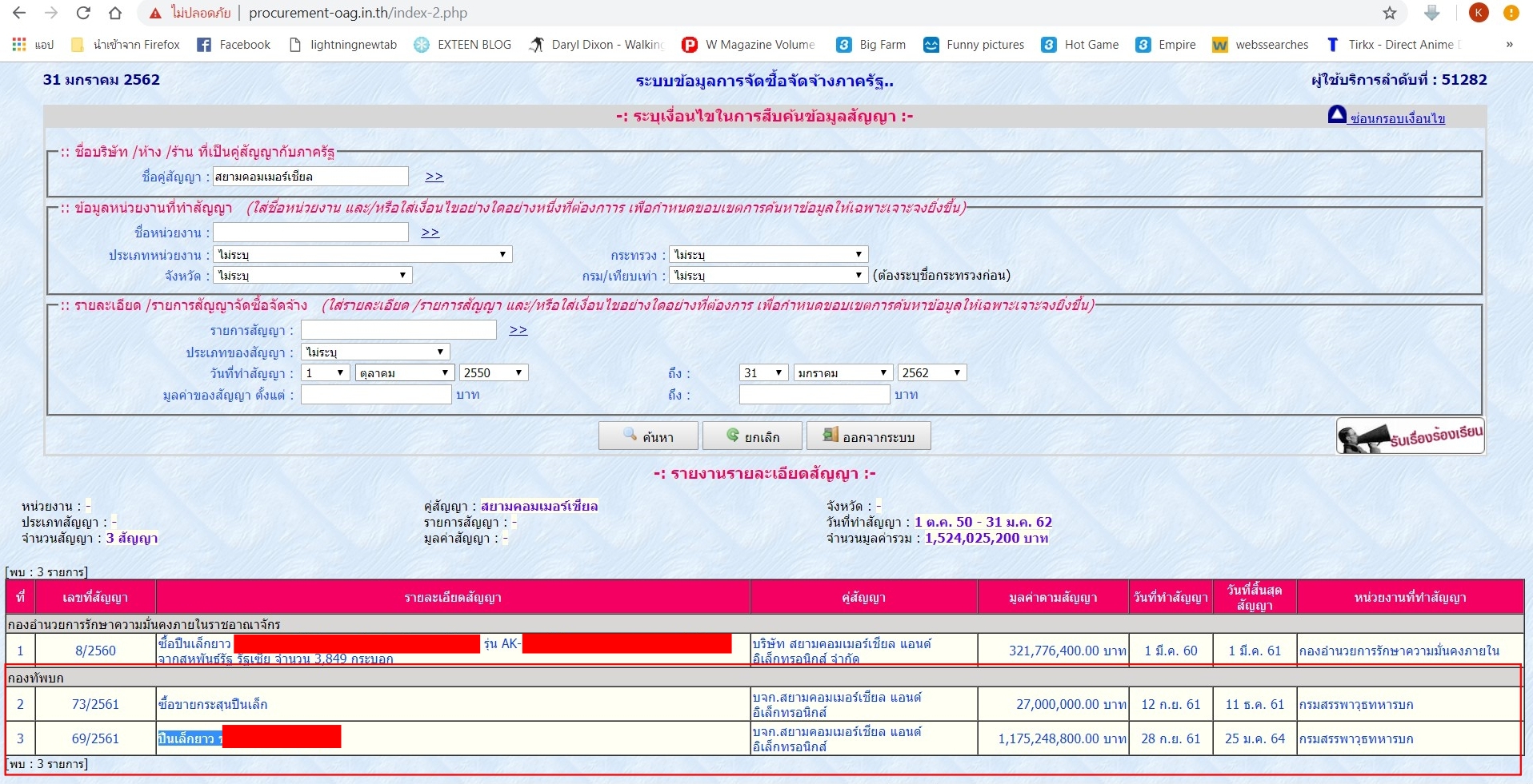2.สัญญาเลขที่ 73/2561 ซื้อขายกระสุนปืนเล็ก ไม่ระบุจำนวน มูลค่าสัญญา 27,000,000 บาท วันเริ่มทำสัญญา 12 ก.ย.2561- 11 ธ.ค.2561
