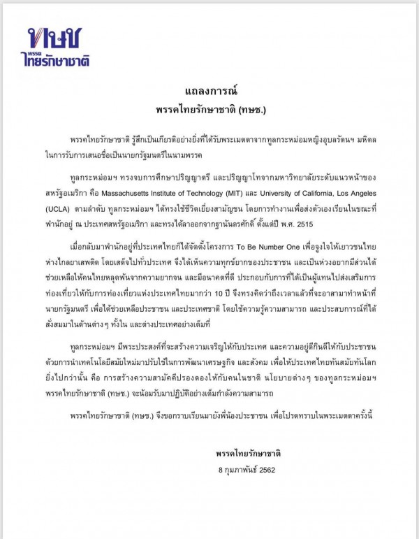 สำนักข่าวอิศรา www.isranews.org รายงานว่า เมื่อวันที่ 8 ก.พ.2562 ตัวแทนจากพรรคไทยรักษาชาติ (ทษช.) ได้เข้ายื่นบัญชีรายชื่อนายกรัฐมนตรีของพรรคฯ ต่อคณะกรรมการการเลือกตั้ง (กกต.) โดยได้เสนอพระนามของ ทูลกระหม่อมหญิงอุบลรัตนราชกัญญา สิริวัฒนาพรรณวดี เพียงพระองค์เดียว