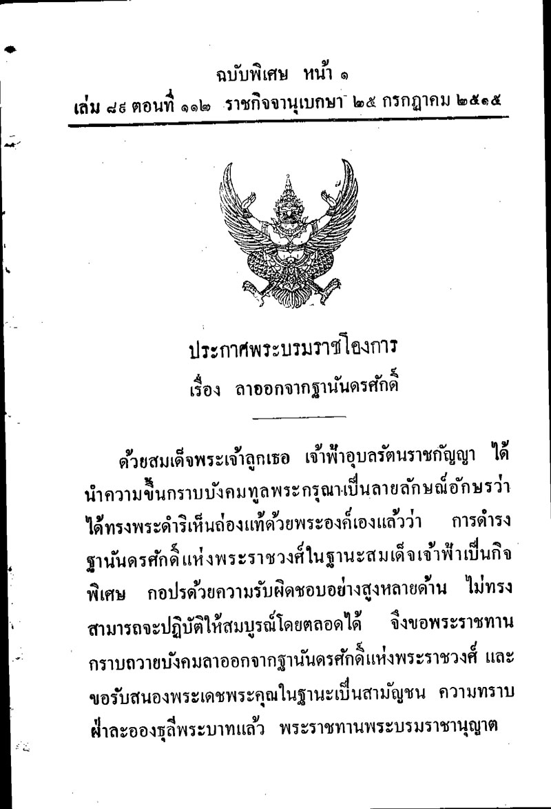หมายเหตุ สำนักข่าวอิศรา www.isranews.org : เป็นประกาศพระบรมราชโองการ เรื่อง ลาออกจากฐานันดรศักดิ์ ของ สมเด็จพระเจ้าลูกเธอ เจ้าฟ้าอุบลรัตนราชกัลยา ที่มีการเผยแพร่ผ่านทางราชกิจจานุเบกษา เมื่อปี พ.ศ. 2515