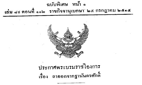 เปิดราชกิจจาฯ 25 ก.ค. 2515 เผยแพร่ ประกาศพระบรมราชโองการ ลาออกจากฐานันดรศักดิ์ เจ้าฟ้าอุบลรัตนราชกัลยา