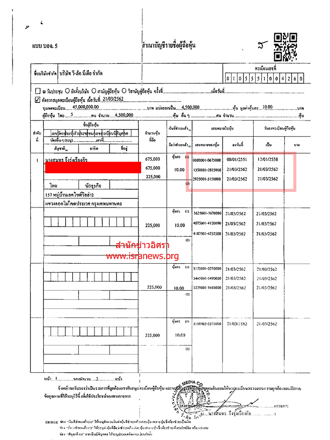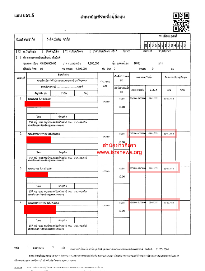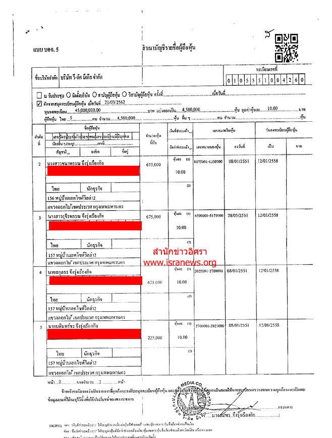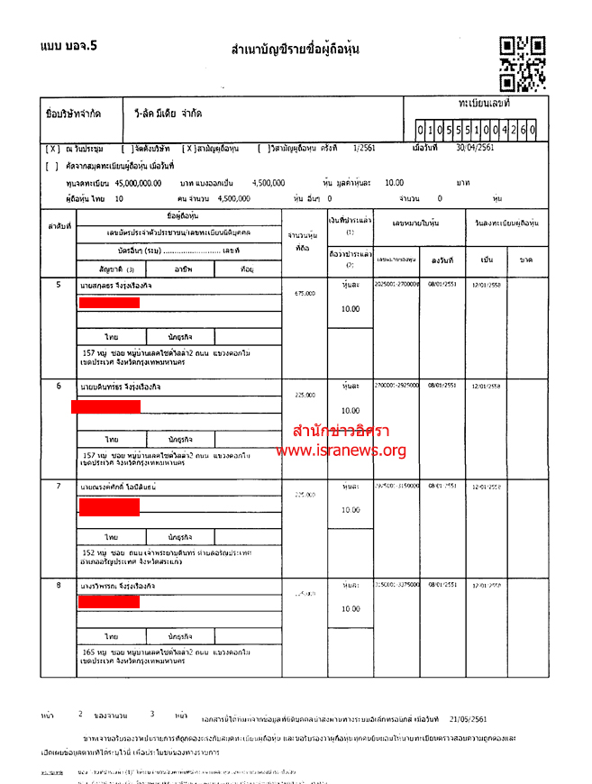 กระทั่งวันที่ 21 มี.ค.2562 มีการยื่นจดทะเบียนเปลี่ยนแปลงผู้ถือหุ้น เหลือผู้ถือหุ้น 5 คน