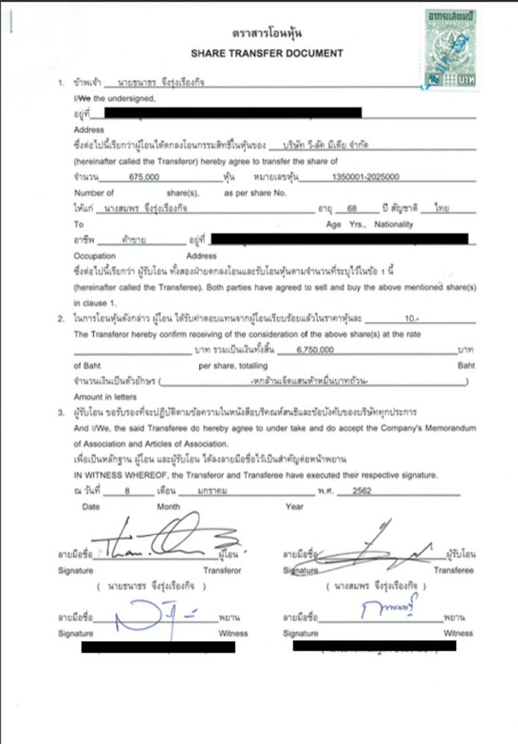 สำหรับเอกสารที่นายธนาธรนำมาชี้แจงนั้น เป็นตราสารโอนหุ้น ระบุชื่อนายธนาธร โอนหุ้นบริษัท วี-ลัค มีเดีย จำกัด มูลค่า 675,000 หุ้น มูลค่า 6,750,000 บาท ให้แก่นางสมพร จึงรุ่งเรืองกิจ โดยลงลายมือชื่อไว้เป็นสำคัญต่อหน้าพยาน เมื่อวันที่ 8 ม.ค. 2562 ลงชื่อนายธนาธรผู้โอน นางสมพรผู้รับโอน และพยาน 2 ราย (ดูเอกสารประกอบ)