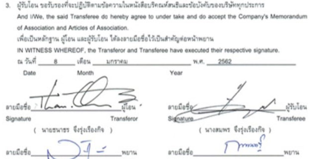 ทั้งนี้ “หนังสือตราสารโอนหุ้น” ระหว่างนายธนาธรกับนางสมพร ฉบับวันที่ 8 ม.ค.2562 ที่นายธนาธร นำมาเปิดเผยเมื่อวันที่ 23 มี.ค.2562 ข้อ 3 ระบุว่า “เพื่อเป็นหลักฐาน ผู้โอน และผู้รับโอน ได้ลงลายมือชื่อไว้เป็นสำคัญต่อหน้าพยาน ณ วันที่ 8 เดือน มกราคม พ.ศ.2562”
