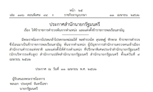 • โปรดเกล้าฯ โอนย้าย พล.ต.ท.สุรเชษฐ์ เป็นขรก.พลเรือน นั่งที่ปรึกษาพิเศษประจำสำนักนายกฯ