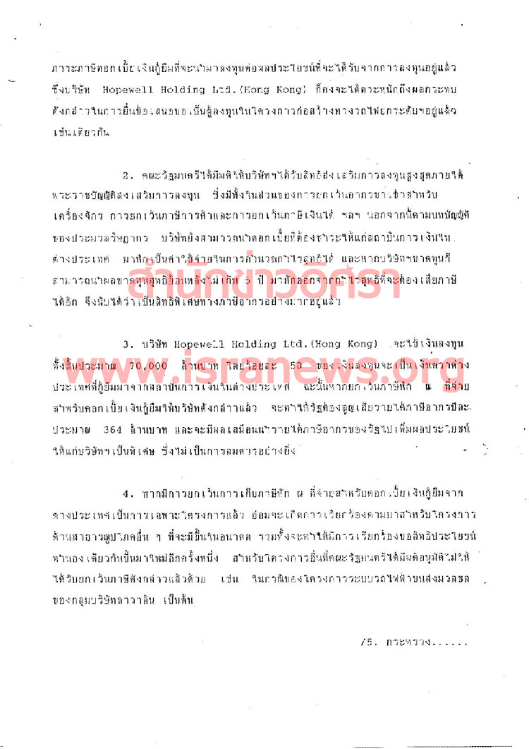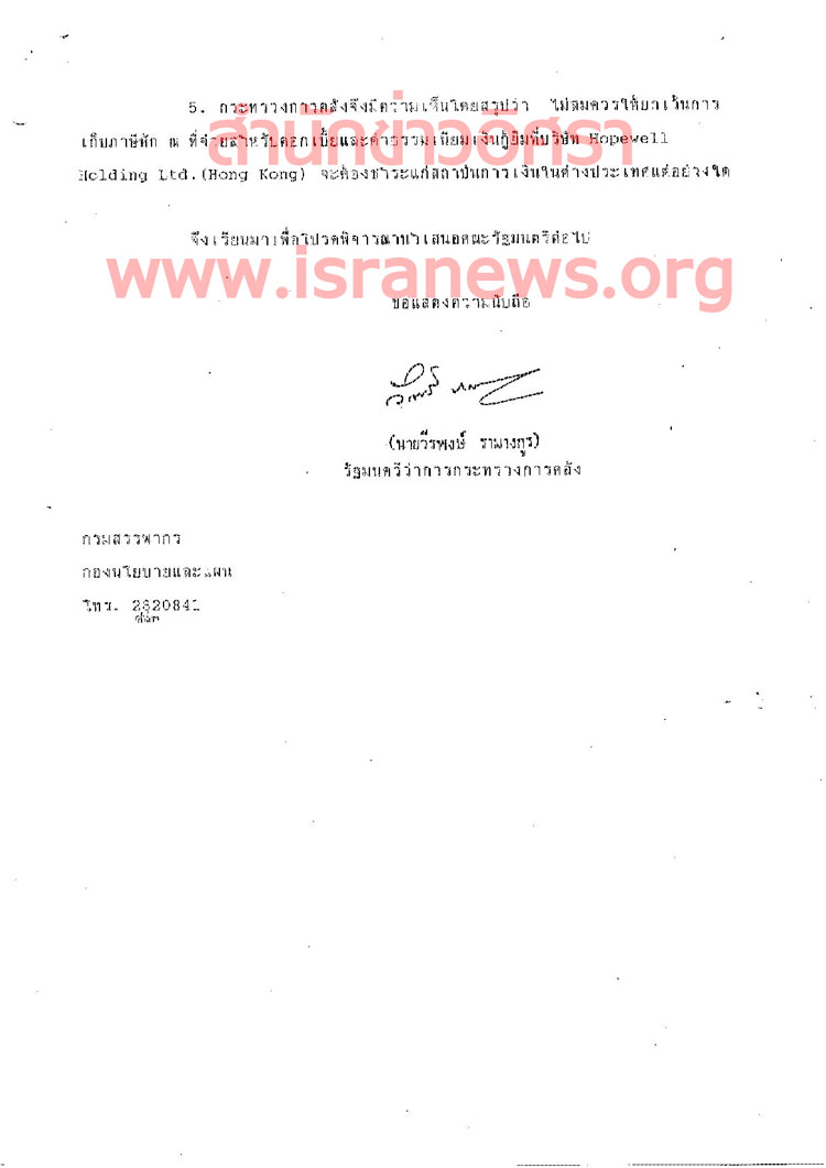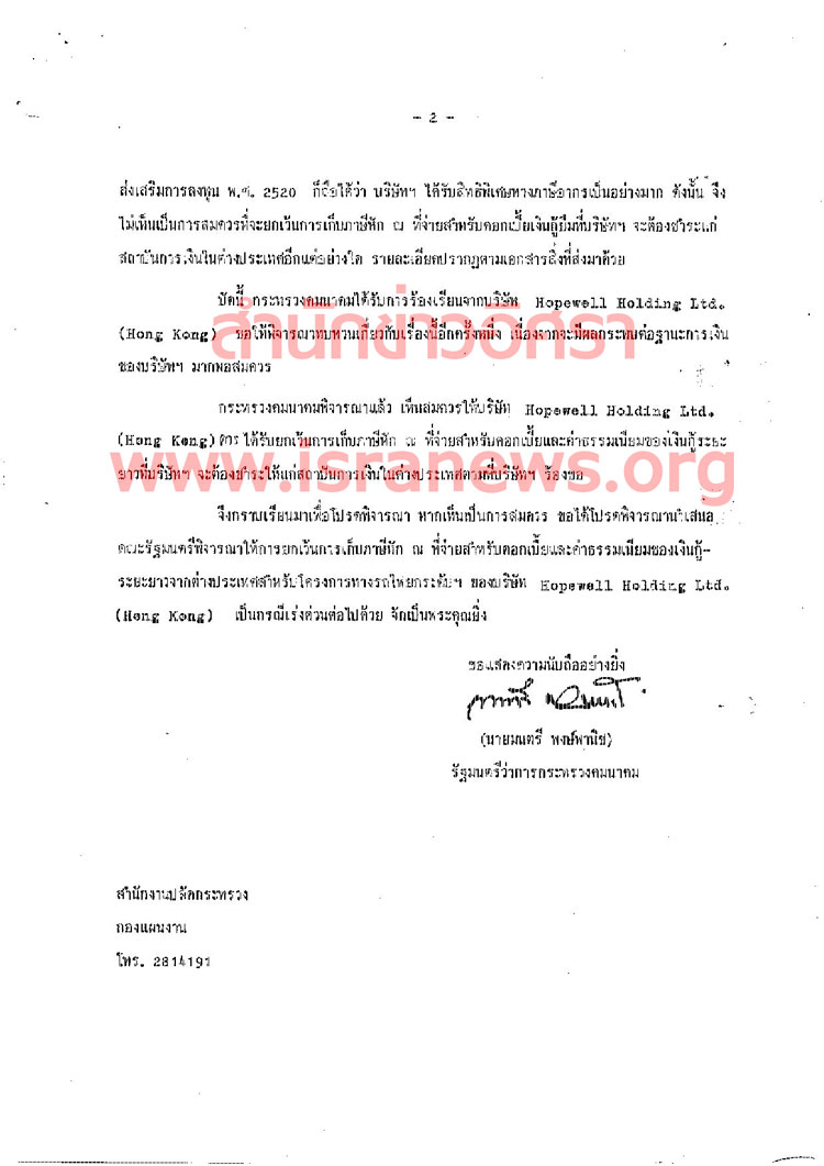2.เรื่องการขอยกเว้นการเก็บภาษีหัก ณ ที่จ่ายสำหรับดอกเบี้ย และค่าธรรมเนียมของเงินกู้ระยะยาว ที่บริษัท Hopewell จะต้องชำระให้แก่สถาบันการเงินในต่างประเทศ โดยขอให้กระทรวงการคลังพิจารณา และประสานงานต่อไป