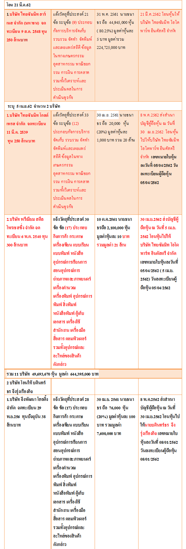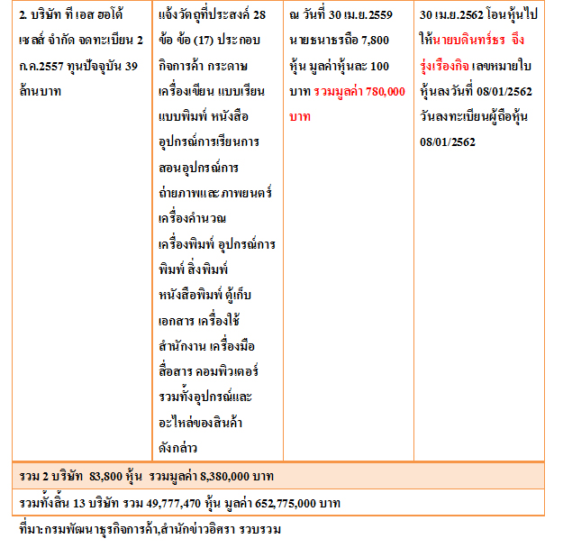 2.2 บริษัท ที เอส ฮอโต้ เซลส์ จำกัด 30 เม.ย.2562 โอนไปให้นายบดินทร์ธร 7,800 หุ้น เลขหมายใบหุ้นลงวันที่ 08/01/2562 วันลงทะเบียนผู้ถือหุ้น 08/01/2562