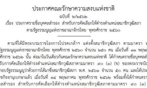 ก่อนหน้านี้ เมื่อวันที่ 14 พ.ค. 2562 ราชกิจจานุเบกษา ยังได้เผยแพร่ ประกาศคณะรักษาความสงบแห่งชาติ ฉบับที่ 1/2562 เรื่อง การกำหนดรายชื่อบุคคลสำรอง สำหรับการคัดเลือกให้ดำรงตำแหน่งสมาชิกวุฒิสภา ตามพระราชบัญญัติประกอบรัฐธรรมนูญว่าด้วยการได้มาซึ่งสมาชิกวุฒิสภาพ.ศ. 2561 เพื่อให้การดำเนินการตามรัฐธรรมนูญแห่งราชอาณาจักรไทย พุทธศักราช 2562 มาตรา 269 และพระราชบัญญัติประกอบรัฐธรรมนูญว่าด้วยการได้มาซึ่งสมาชิกวุฒิสภา พ.ศ. 2561 มาตรา 98 และมาตรา 99 (รายชื่อสำรองจากการเลือกตั้งของ กกต.) คณะรักษาความสงบแห่งชาติจึงประกาศรายชื่อบุคคลในบัญชีสำรองรวม 50 ราย (อ่านประกอบ : โปรดเกล้าฯ 250 สว. อดีตบิ๊กทหาร-พล.อ.ปรีชา-เนาวรัตน์-สังศิต คนดังพรึ่บ-สำรองอีก 50 ชื่อ)