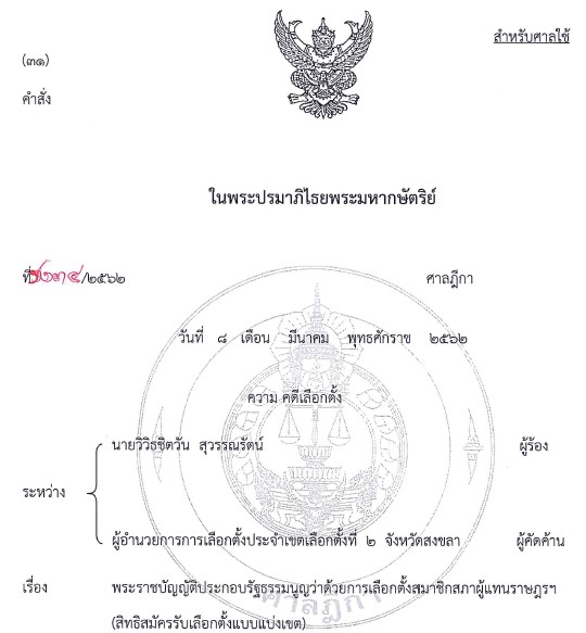 คำพิพากษาศาลฎีกาที่ 1234/2562 วันที่ 8 มี.ค.2562 ความเลือกตั้ง ระหว่าง นายวิวิธชิตวัน สุวรรณรัตน์ ผู้ร้อง ผู้อำนวยการการเลือกตั้งประจำเขตเลือกตั้งที่ 2 จังหวัดสงขลา ผู้คัดค้าน