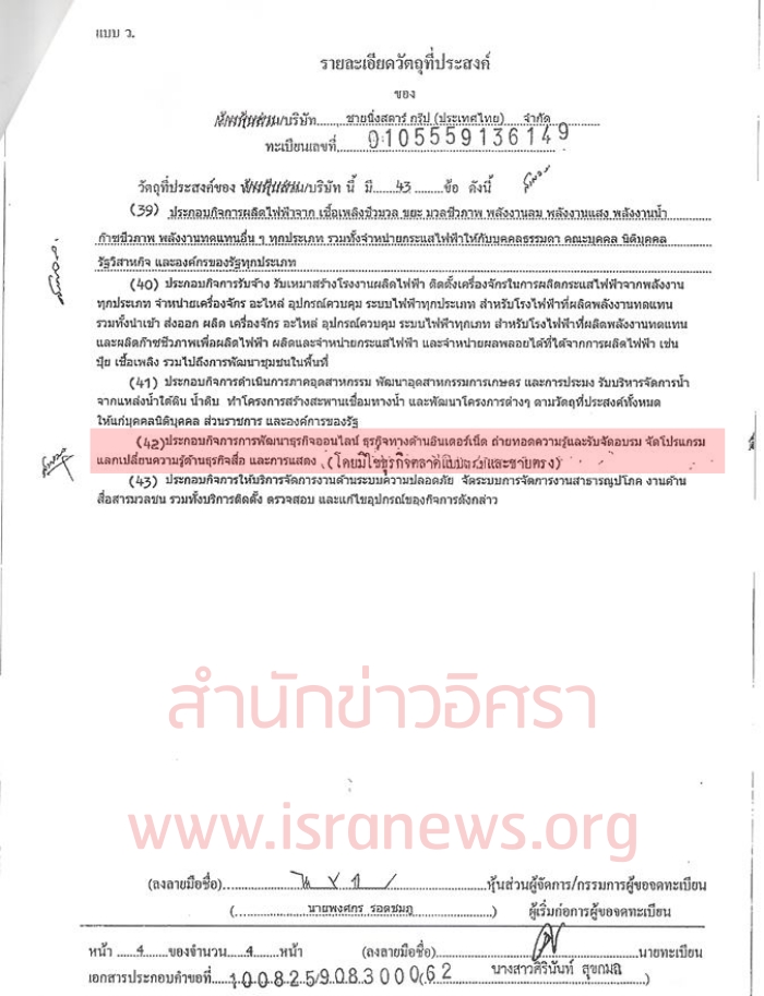 ล่าสุดสำนักข่าวอิศราตรวจสอบพบว่า บริษัทดังกล่าวแจ้งวัตถุที่ประสงค์เกี่ยวข้องกับกิจการสื่อด้วย