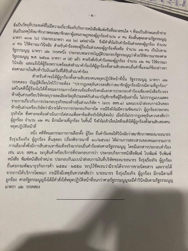 ศาล รธน. รับคำร้อง 32 ส.ส. เข้าข่ายถือหุ้นสื่อ ตีตก 9 ราย ‘กรณ์-ปารีณา’ รอด ไม่สั่งยุติปฏิบัติหน้าที่ เหตุไม่ได้มีการตั้ง กก.ไต่สวนข้อเท็จจริง แค่ส่งเอกสารกรมพัฒนาธุรกิจการค้า-งบการเงิน จึงยังไม่มีเหตุอันควรสงสัย เทียบเคส ‘ธนาธร’ ถูก กกต.สอบแล้ว งบการเงินปี’54-58 มัดทำธุรกิจสื่อ