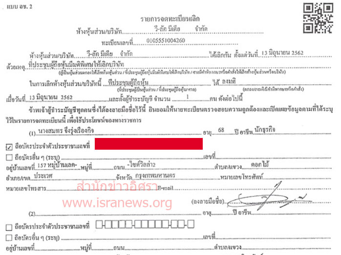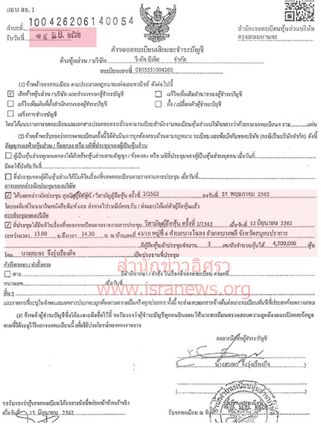 สำนักข่าวอิศรา www.isranews.org รายงานว่า เมื่อวันที่ 14 มิ.ย.2562 บริษัท วี-ลัค มีเดีย จำกัด โดยนางสมพร จึงรุ่งเรืองกิจ ในฐานะกรรมการผู้มีอำนาจได้มอบอำนาจให้นายฉัตรชัย เตชะมนตรีกุล ยื่นคำขอจดทะเบียนเลิกและชำระบัญชี บริษัท วี-ลัค มีเดีย จำกัด ต่อสำนักงานทะเบียนหุ้นส่วนบริษัทกรุงเทพมหานคร โดยแนบเอกสารรายงานการประชุมวิสามัญผู้ถือหุ้น ครั้งที่ 2/2562 เมื่อวันที่ 13 มิ.ย.2562 ณ ที่บ้านเลขที่ 43/10 หมู่ที่ 6 ต.บางโฉลง อ.บางพลี จ.สมุทรปราการ ยื่นแสดงเป็นหลักฐาน (ดูเอกสาร)
