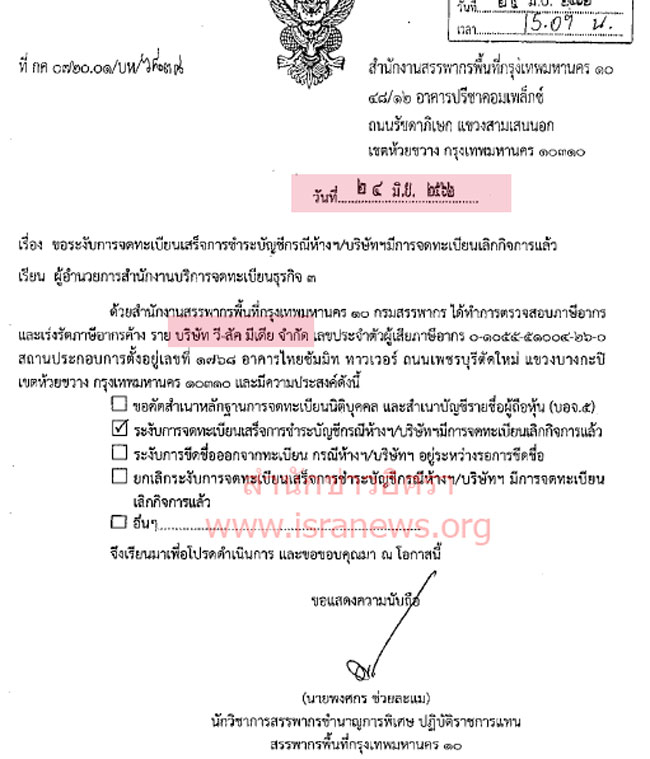 สำนักข่าวอิศรารายงานว่า ต่อมาเมื่อวันที่ 24 มิ.ย.2562 นายพงศกร ช่วยละแม นักวิชาการสรรพากรชำนาญการพิเศษ ปฏิบัติราชการแทนสรรพากรพื้นที่กรุงเทพมหานคร 10 ทำหนังสือถึงผู้อำนวยการสำนักงานบริการจดทะเบียนธุรกิจ 3 ระบุว่า สำนักงานสรรพากรพื้นที่กรุงเทพมหานคร 10 ได้ทำการตรวจสอบภาษีอากรและเร่งรัดภาษีอากรค้าง รายบริษัท วี-ลัค มีเดีย จำกัด และมีความประสงค์ขอให้ระงับการการจดทะเบียนเสร็จการชำระบัญชี บริษัท วี-ลัค มีเดีย จำกัด (ดูเอกสาร)