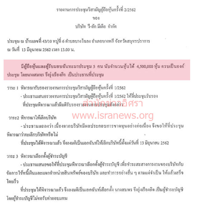 สำนักข่าวอิศรารายงานว่า รายงานการประชุมผู้วิสามัญผู้ถือหุ้นฉบับดังกล่าวระบุว่า มีผู้ถือหุ้นและผู้รับมอบฉันทะเข้าร่วมประชุม จำนวน 5 คน นับจำนวนหุ้นได้ 4,500,000 หุ้น นางสมพร จึงรุ่งเรืองกิจ เป็นประธานที่ประชุม วาระพิจารณาให้เลิกบริษัท นางสมพรแถลงว่าเนื่องจากบริษัทมีผลประกอบการขาดทุนอย่างต่อเนื่อง จึงขอให้ที่ประชุมพิจารณาว่าจะเลิกบริษัทหรือไม่ ที่ประชุมมีมติเอกฉันท์ให้เลิกบริษัทตั้งแต่วันที่ 13 มิ.ย.2562 (ดูเอกสาร)