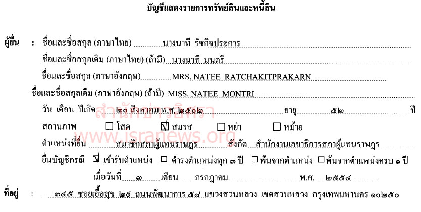 อย่างไรก็ตาม สำนักข่าวอิศรา นำรายละเอียดการยื่นบัญชีแสดงรายการทรัพย์สินของนางนาที กรณีรับตำแหน่ง ส.ส.วันที่ 3 ก.ค.2554 มารายงานอย่างละเอียด