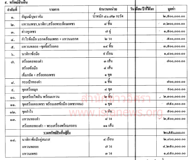 ทรัพย์สินอื่น 13 รายการ ( นาฬิกา เครื่องประดับ) มูลค่า 20,950,000 บาท