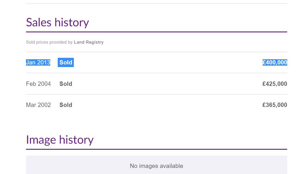 นอกจากนี้ ยังพบประวัติการซื้อขายของบ้านหลังนี้ โดยระบุวันที่มีการขายล่าสุดว่าอยู่ในเดือน ม.ค. 2556 โดยผู้ซื้อได้ซื้อบ้านหลังนี้ไปในราคา 400,000 ปอนด์ (15,507,052 บาท)