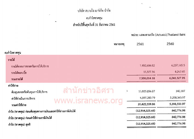ก่อนหน้านี้ รอบปี 2557 แจ้งมีรายได้ 1,400,826,357.86 บาท รอบปี 2558 รายได้ 1,135,339,503.06 บาท หลังจากนั้นรอบปี 2559-2561 ลดเหลือ 202,712.58 บาท , 199,310.63 บาท และ 202,714.16 บาท ตามลำดับ