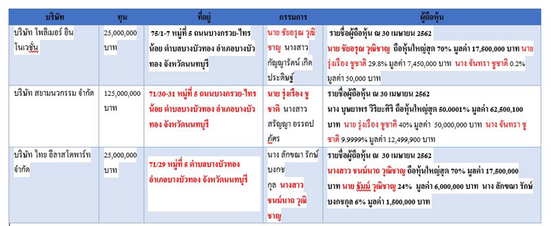 บริษัท โพลิเมอร์ อินโนเวชั่น จำกัด บริษัท สยามนวกรรม จำกัด และ บริษัท ไทย อีลาสโตพาร์ท จำกัด มีความสัมพันธ์เชื่อมโยงเป็นบริษัทกลุ่มเดียวกันจริง อาทิ แจ้งที่อยู่บริเวณใกล้เคียงกัน ขณะที่กรรมการผู้ถือหุ้น บางบริษัทเป็นกลุ่มเดียวกัน เช่น นางสาว ชนม์นาถ วุฒิชาญ กรรมการผู้ถือหุ้นใหญ่บริษัท ไทย อีลาสโตพาร์ท จำกัด มีนามสกุลเดียวกับ นาย ชัยอรุณ วุฒิชาญ กรรมการผู้ถือหุ้นใหญ่บริษัท โพลิเมอร์ อินโนเวชั่น จำกัด เป็นต้น