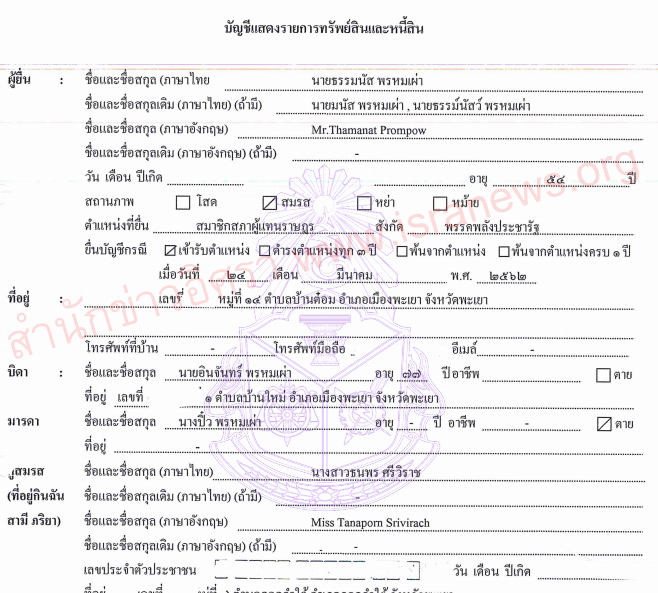 นางอริสรา ไม่มีเงินสด มีเงินฝาก 10,464,853.99 บาท เงินลงทุน 18,200,000 บาท ที่ดิน 100,069,025 บาท โรงเรือนละสิ่งปลูกสร้าง 49,398,898 บาท ยานพาหนะ 3,390,000 บาท ทรัพย์สินอื่น 8,430,000 บาท รวทรัพย์สิน 189,952,776.99 บาท หนี้สิน 13,582,860.47 บาท