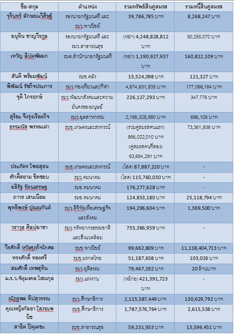 สำนักข่าวอิศรา www.isranews.org ตรวจสอบข้อมูลจำนวน ส.ส. จำนวน 21 ราย ที่ได้รับการแต่งตั้งเป็นรัฐมนตรีในรัฐบาล พล.อ.ประยุทธ์ จันทร์โอชา พบว่ามี ส.ส. ที่ได้รับการแต่งตั้งเป็นรัฐมนตรีอย่างน้อย 6 ราย มีทรัพย์สินเกิน 1 พันล้านบาท และมี 1 ราย มีหนี้สินหลักหมื่นล้านบาท รายละเอียด ดังนี้