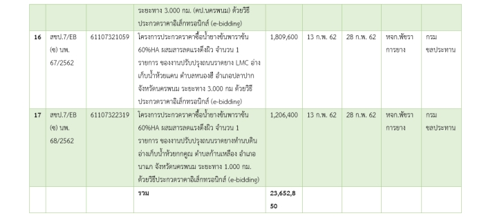 ทั้งนี้ สำนักข่าวอิศรา ตรวจสอบฐานข้อมูลจัดซื้อจัดจ้างหน่วยงานภาครัฐ พบว่า ในช่วงเดือน ธ.ค. 2561 ถึง ก.พ. 2562 ซึ่งเป็นช่วงงบประมาณปี 2562 นั้น หจก.พัชราการยาง ปรากฏเป็นคู่สัญญาขายน้ำยางพาราผสมให้กับ กรมชลประทาน จำนวน 17 สัญญา รวมวงเงิน 23,652,850 บาท โดยใช้วิธีการจัดซื้อจัดจ้างแบบเสนอราคาอิเล็กทรอนิกส์ (e-bidding) 16 สัญญา และแบบเฉพาะเจาะจง 1 สัญญา รายละเอียดปรากฏตามตารางต่อไปนี้