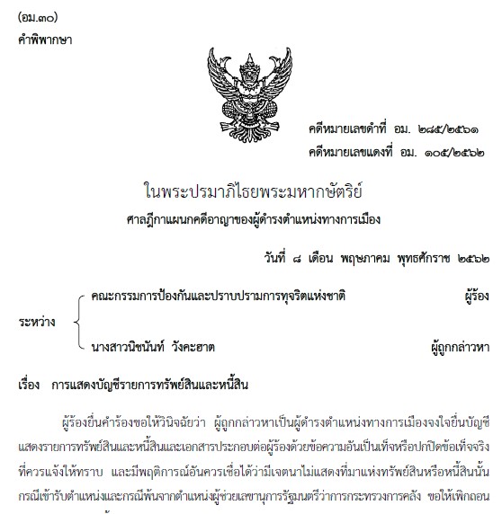 ล่าสุด วันที่ 31 ต.ค.2562 ราชกิจจานุเบกษา เผยแพร่ คำพิพากษาของศาลฎีกาแผนกคดีอาญาของผู้ดำรงตำแหน่งทางการเมือง เรื่อง การแสดงบัญชีรายการทรัพย์สินและหนี้สิน [คดีหมายเลขดำที่ อม. 285/2561 คดีหมายเลขแดงที่ อม. 105/2562 ระหว่าง คณะกรรมการป้องกันและปราบปรามการทุจริตแห่งชาติ ผู้ร้อง นางสาวนิชนันท์ วังคะฮาต ผู้ถูกกล่าวหา]