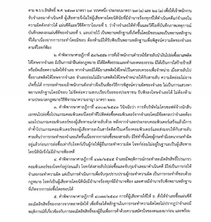 4. คําพิพากษาศาลฎีกาที่ 412/2545 จําเลยมีพฤติการณ์กระทําละเมิดลิขสิทธิ์โปรแกรม คอมพิวเตอร์ของโจทก์อยู่ก่อนแล้ว โจทก์ส่งสายลับไปล่อซื้อและจับกุมจําเลยมาดําเนินคดี มิใช่เป็นการก่อให้ จําเลยกระทําความผิด แต่เป็นการดําเนินการเพื่อจับกุมปราบปรามผู้กระทําความผิด เป็นการกระทําที่ชอบด้วย กฎหมาย โจทก์เป็นผู้เสียหายโดยนิตินัยมีอํานาจร้องทุกข์มีอํานาจฟ้อง และศาลมีอํานาจรับฟังพยานหลักฐาน ที่เกิดจากการล่อซื้อโดยชอบได้