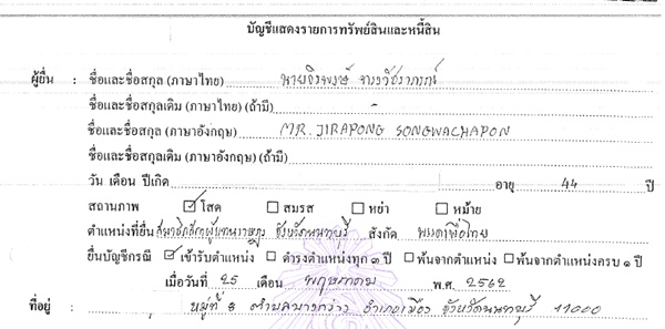 นายจิรพงษ์แจ้งว่า มีทรัพย์สินรวม 31,483,672.61 บาท หนี้สิน 37,886,425.57 บาท เบ็ดเสร็จมีหนี้สินมากกว่าทรัพย์สิน 6,402,752.96 บาท
