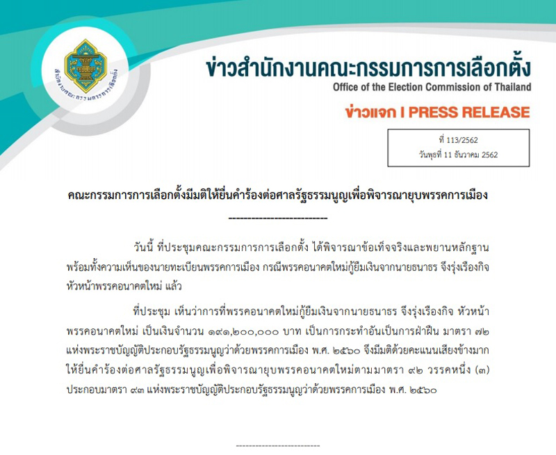 พลันที่คณะกรรมการการเลือกตั้ง (กกต.) มีมติเสียงข้างมาก 5 ต่อ 2 เสียง ให้ส่งศาลรัฐธรรมนูญ ‘ยุบพรรค’ อนาคตใหม่ กรณีกู้เงินนายธนาธร จึงรุ่งเรืองกิจ หัวหน้าพรรคอนาคตใหม่ วงเงิน 191.2 ล้านบาท โดยเห็นว่าฝ่าฝืน พ.ร.บ.ประกอบรัฐธรรมนูญว่าด้วยพรรคการเมือง พ.ศ. 2560 มาตรา 72 กรณีรับบริจาคเงิน ทรัพย์สิน หรือประโยชน์อื่นใด โดยรู้หรือควรจะรู้ว่าได้มาโดยไม่ชอบด้วยกฎหมาย หรือมีเหตุอันควรสงสัยว่ามีแหล่งที่มาโดยไม่ชอบด้วยกฎหมาย (อ่านประกอบ : กฎหมายไม่เปิดช่องให้ทำ! มติ กกต.ชงศาล รธน.ยุบอนาคตใหม่ปมกู้เงิน'ธนาธร')