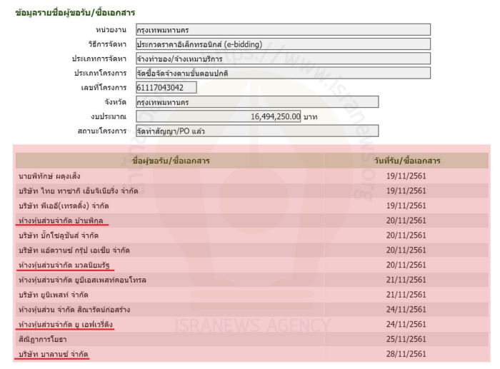 ช่วงวันที่ 19-28 พ.ย. 2561 ปรากฏรายชื่อผู้ขอรับ/ซื้อเอกสาร จำนวน 13 ราย คือ นายพิทักษ์ ผดุงเส็ง บริษัท ไทย ทาซากิ เอ็นจิเนียริ่ง จำกัด บริษัท พีเออี(เทรดดิ้ง) จำกัด ห้างหุ้นส่วนจำกัด บ้านพิกุล บริษัท บั๊กโซลูชันส์ จำกัด บริษัท แอ๊ดวานซ์ กรุ๊ป เอเซีย จำกัด ห้างหุ้นส่วนจำกัด มวลนิยมรัฐ ห้างหุ้นส่วนจำกัด ยูบีเอสเพสท์คอนโทรล บริษัท ยูนิเพสท์ จำกัด ห้างหุ้นส่วน จำกัด สิณารัตน์ก่อสร้าง ห้างหุ้นส่วนจำกัด ยู เอฟเวรี่ติง สิณิฏาการโยธา และ บริษัท บาลานซ์ จำกัด