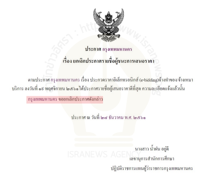 จากนั้นในวันเดียวกัน (28 ธ.ค. 2561) ประกาศยกเลิกผู้ชนะการเสนอราคา ทั้งนี้ไม่ได้ระบุสาเหตุของการยกเลิกดังกล่าว