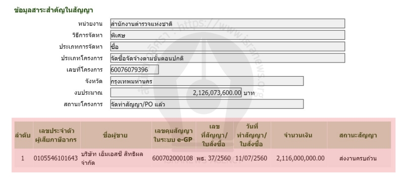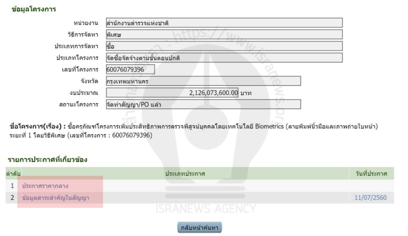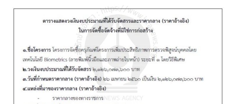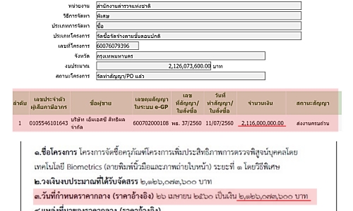 - พบแล้ว! ข้อมูลสัญญาไบโอเมตริกซ์ 2.1 พันล.! สตช.จัดซื้อวิธีพิเศษ ชนะต่ำกว่าราคากลาง 10 ล.