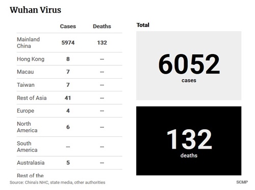 วันที่ 29 มกราคม เว็บไซต์ South China Morning Post รายงานอ้างคณะกรรมการสาธารณสุขแห่งชาติจีนแถลงยอดผู้เสียชีวิตล่าสุดอยู่ที่ 132 ราย โดยพบผู้ติดเชื้อไวรัสโคโรน่า 5,974 คน ซึ่งนับว่า เป็นจำนวนที่สูงกว่าการกระบาดของโรคซาร์ ในปี 2545-2547 จนทำให้มีผู้เสียชีวิตกว่า 600 คนทั่วโลก