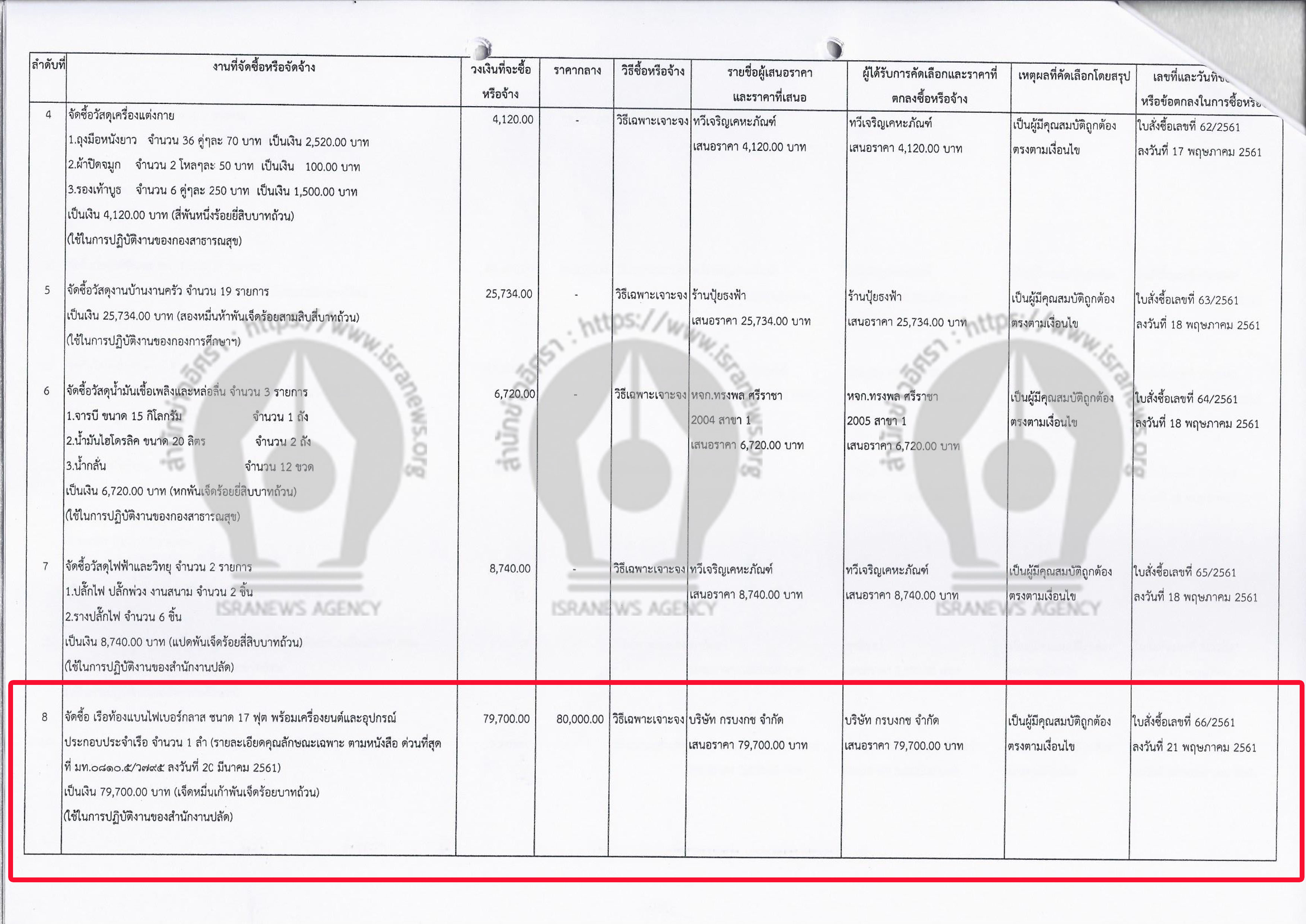 จัดซื้อเรือท้องแบนไฟเบอร์กลาส ขนาด 17 ฟุต พร้อมเครื่องยนต์และอุปกรณ์ประกอบประจำเรือ จำนรวน 5 ลำ เป็นราคาทั้งสิ้น 372,000 บาท เฉลี่ยลำละ 74,400 บาท ใช้วิธีเฉพะาเจาะจง ทำสัญญาสั่งซื้อเมื่อวันที่ 27 มิ.ย.2561 (ดูเอกสารประกอบ)