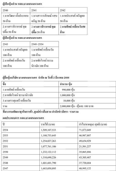 ล่าสุด วันที่ 2 มีนาคม 2555 แปรสภาพเป็นบริษัท บางแสนมหานครจำกัด มีผู้ถือหุ้น 3 คน คือ นายทิพย์ เกลื่อนวัน จำนวน 990,000 หุ้น นายชัยโรจน์ ธรรมานิรามัย 1,000,000 หุ้น และ นางสาวสุนทรี เกลื่อวัน 10,000 หุ้น รวมหุ้นทั้งหมด 2,000,000 หุ้น มูลค่าหุ้นละ 100 บาท (ดูตาราง)