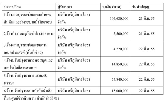 น่าสังเกตว่า การรับเหมาทั้ง 6 สัญญา แบ่งออกเป็น วันที่ 21 มีนาคม 2555 จำนวน 2 สัญญา และวันที่ 22 มีนาคม 2555 จำนวน 4 สัญญา