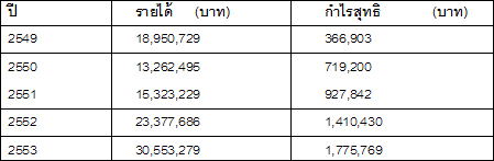 น่าสังเกตว่ารายได้มากขึ้นในช่วง 2 ปีหลัง โดยเฉพาะปี 2552 รายได้ 23,377,686 บาท กำไรสุทธิ1,410,430 บาท ปี 2553 รายได้ 30,553,279 บาท กำไรสุทธิ 1,775,769 บาท