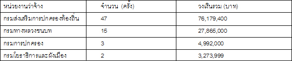 สำนักข่าวอิศรา (www.isranews.org) ตรวจสอบพบว่า นับจาก ปี 2543 เป็นต้นมาถึงต้นเดือนมิถุนายน 2554 บริษัท พงศ์เรืองรองก่อสร้าง จำกัด ได้รับว่าจ้างเป็นคู่สัญญากับหน่วยงานรัฐทั้งสิ้น 67 ครั้ง (สัญญา) วงเงิน 111,510,399 บาท ในจำนวนนี้เป็นหน่วยงานในกระทรวงมหาดไทย มากสุด คือ กรมส่งเสริมการปกครองท้องถิ่น 47 ครั้ง รวมวงเงิน 76,179,400 บาท (อบจ.เทศบาล อบต.) รองลงมา กรมทางหลวงชนบท 15 ครั้ง กรมการปกครอง 3 ครั้ง และกรมโยธาธิการและผังเมือง 2 ครั้งตามลำดับ (ดูตาราง)