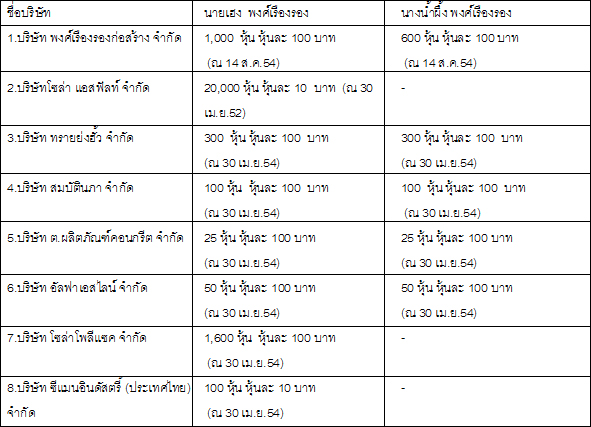 สำนักข่าวอิศรา (www.isranews.org) ตรวจสอบพบว่า ครอบครัวพงศ์เรืองรอง เป็นเจ้าของธุรกิจรับเหมาก่อสร้างชื่อ บริษัท พงศ์เรืองรองก่อสร้าง จำกัด จดทะเบียนวันที่ 26 กุมภาพันธ์ 2538 ทุนจดทะเบียน 1 ล้านบาท ต่อมาเพิ่มเป็น 5 ล้านบาท ที่ตั้งเลขที่ 33/1 หมู่ที่ 8 ตำบลหนองกบ อำเภอบ้านโป่ง จังหวัดราชบุรี นายไชยา พงศ์เรืองรอง ถือหุ้นใหญ่ 6,000 หุ้น นายเฮง พงศ์เรืองรอง 1,000 หุ้น นางน้ำผึ้ง พงศ์เรืองรอง 600 หุ้น นายอริสมันต์ 600 หุ้น (ดูตาราง)