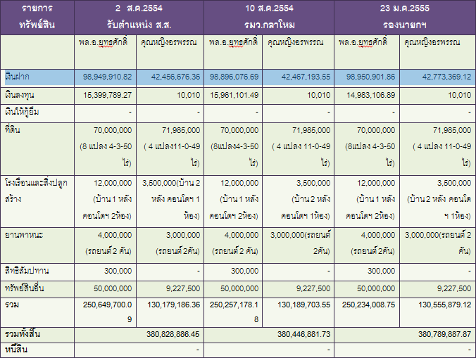 ตอนรับตำแหน่ง ส.ส.บัญชีรายชื่อ 2 สิงหาคม 2554 พล.อ.ยุทธศักดิ์ มีเงินฝาก 98,949,910.82 บาท ตอนรับตำแหน่งรองนายกฯวันที่ 23 มกราคม 2555 มีเงินฝาก 98,950,901.86 บาท เพิ่มขึ้น 991.04 บาท ขณะที่คุณหญิงอรพรรณในช่วงเดียวกันมีเงินฝากเพิ่มขึ้น 316,693 บาท