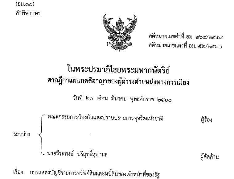 3.นายวีระพงษ์ บริสุทธิ์สุขกมล กรรมการ บริษัท ไม้อัดไทย จำกัด จงใจไม่ยื่นบัญชีแสดงรายการทรัพย์สินและหนี้สิน และเอกสารประกอบต่อผู้ร้อง ภายในระยะเวลากำหนด กรณีพ้นจากตำแหน่งมาแล้ว 1 ปี ในการดำรงตำแหน่งวาระที่ 1 และ วาระที่สอง ตามพระราชบัญญัติประกอบรัฐธรรมนูญว่าด้วยการป้องกันและปราบปรามการทุจริต พ.ศ.2542 มาตรา 39 ( 15) ประกอบมาตรา 32 และ 33 และห้ามมิให้ผู้คัดค้านดำรงตำแหน่งเจ้าหน้าที่ของรัฐ เฉพาะตำแหน่งตามมาตรา 39 และ มาตรา 40 เป็นเวลา 5 ปี นับแต่วันที่ 9 พ.ย. 2554 ซึ่งเป็นวันที่ผู้คัดค้านพ้นจากตำแหน่งกรรมการ บริษัท ไม้อัดไทย จำกัด วาระที่ 2 ตามพระราชบัญญัติประกอบรัฐธรรมนูญว่าด้วยการป้องกันและปราบปรามการทุจริต พ.ศ.2542 มาตรา 41