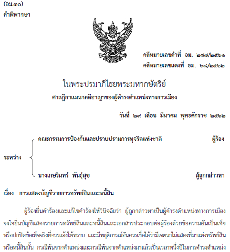 ผู้ถูกกล่าวหายื่นบัญชีฯ กรณีเข้ารับตำแหน่งสมาชิกสภาเทศบาลเมืองมุกดาหาร ครั้งที่ 3 เมื่อวันที่ 16 มี.ค.2558 โดยไม่แสดงรายการทรัพย์สิน ได้แก่ ที่ดิน จำนวน 7 แปลง ที่ดินตามหนังสือรับรองการทำประโยชน์ 1 แปลง รถยนต์ 1 คัน และไม่แสดงรายการหนี้สิน ได้แก่ เงินกู้ 3 บัญชี รายการเช่าซื้อรถยนต์ 1 คัน สำหรับกรณีเข้ารับตำแหน่งสมาชิกสภาเทศบาลเมืองมุกดาหาร ครั้งที่ 2 ขาดอายุความทางอาญาแล้ว (คดีหมายเลขแดงที่ อม.68/2562 วันที่ 29 มี.ค.2562)