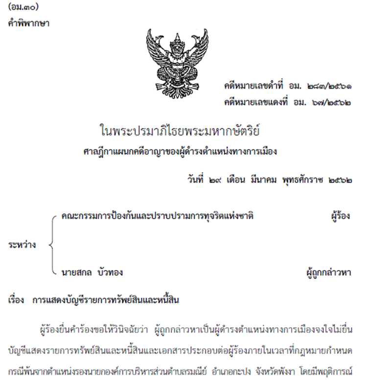 นายสกล บัวทอง รองนายกองค์การบริหารส่วนตำบล (อบต.) รมณีย์ อ.กะปง จ.พังงา จงใจไม่ยื่นบัญชีแสดงรายการทรัพย์สินและหนี้สินและเอกสารประกอบต่อผู้ร้องภายในเวลาที่กฎหมายกำหนดกรณีพ้นจากตำแหน่งรองนายก อบต.รมณีย์ อ.กะปง ห้ามมิให้ผู้ถูกกล่าวหาดำรงตำแหน่งทางการเมืองหรือดำรงตำแหน่งใดในพรรคการเมืองเป็นเวลาห้าปีนับแต่วันที่ 16 ม.ค.2559 ซึ่งเป็นวันที่ผู้ถูกกล่าวหาพ้นจากตำแหน่ง กับมีความผิดตามพระราชบัญญัติประกอบรัฐธรรมนูญว่าด้วยการป้องกันและปราบปรามการทุจริต พ.ศ. 2542 มาตรา 119 จำคุก 2 เดือนและปรับ 8,000 บาท ผู้ถูกกล่าวหาให้การรับสารภาพ เป็นประโยชน์แก่การพิจารณา มีเหตุบรรเทาโทษลดโทษให้กึ่งหนึ่ง คงจำคุก 1 เดือน และปรับ 4,000 บาท ไม่ปรากฏว่าผู้ถูกกล่าวหาเคยได้รับโทษจำคุกมาก่อน โทษจำคุกจึงให้รอการลงโทษไว้มีกำหนด 1 ปี (คดีหมายเลขแดงที่ อม.67/2562 วันที่ 29 มี.ค.2562)